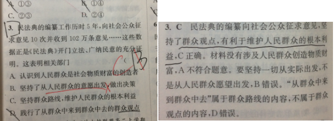 2023.11.4 政治 《高中政治小题狂做.必修4》 第33页第三题C选项 疑惑点:题目中C选项是“坚持群众路线”,所给参考答案是“坚持群众观点”,哪个说法正确?编辑解答: