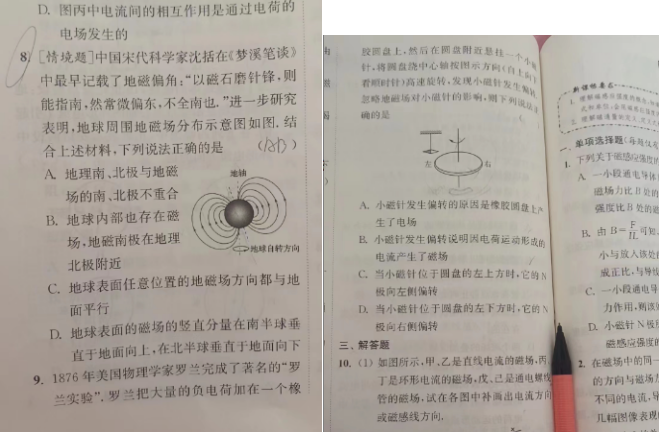 安徽 11.28 物理 《高中物理小题狂做新教材必修第三册》人教版 第八题的d选项 为什么对呢 第九题的C小磁针不应该N极向上吗 第十题的戊怎么画出来的?